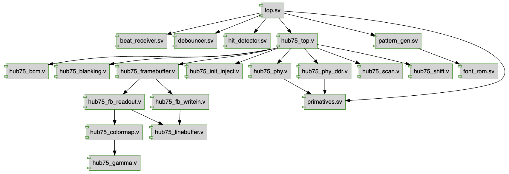 The modules that we wrote were: top, pattern_gen, font_rom, debouncer, beat_reciever, hit_detector. Testbenches were written to test them individually.